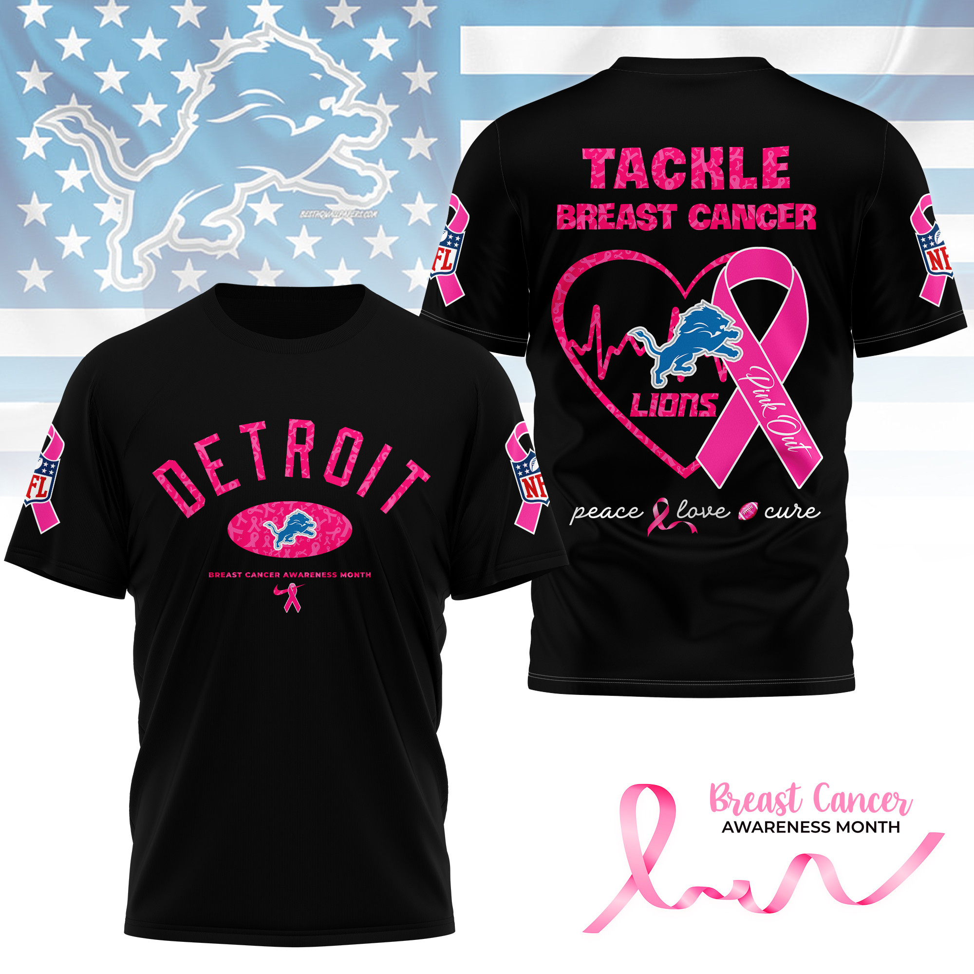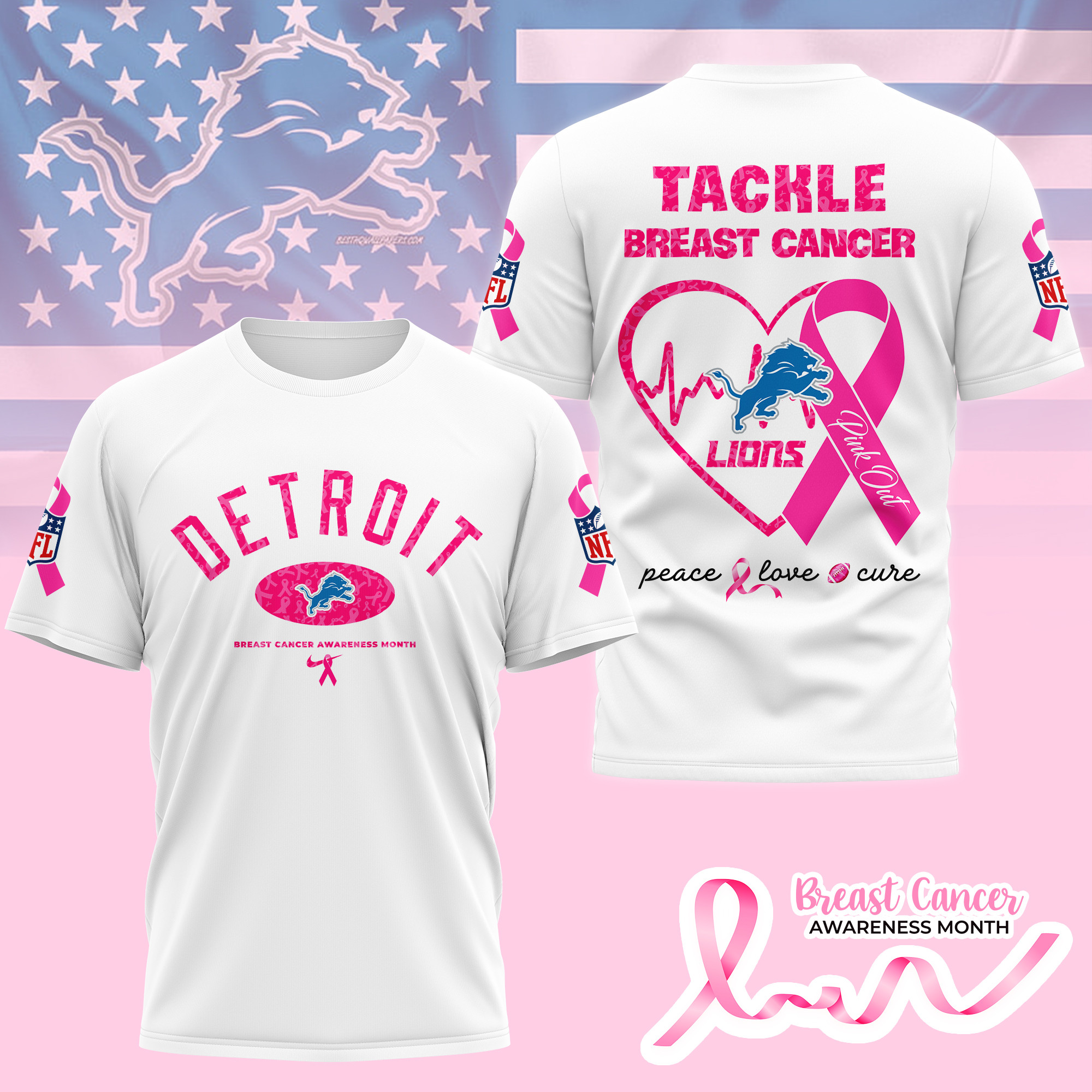 Detroit Lions Premium Tackle Breast Cancer 3D Shirt