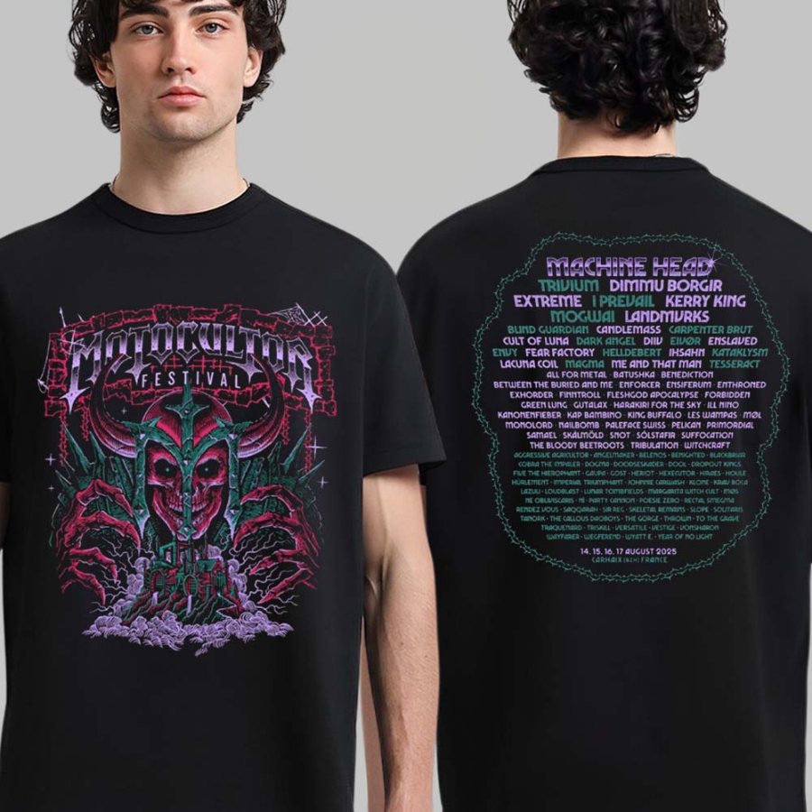 Motocultor Festival 2025 Merchandise Skeleton Knight Art With Tour Dates In Carhaix-Plouguer France On 14 15 16 17 August 2025 Two Sided T-Shirt
