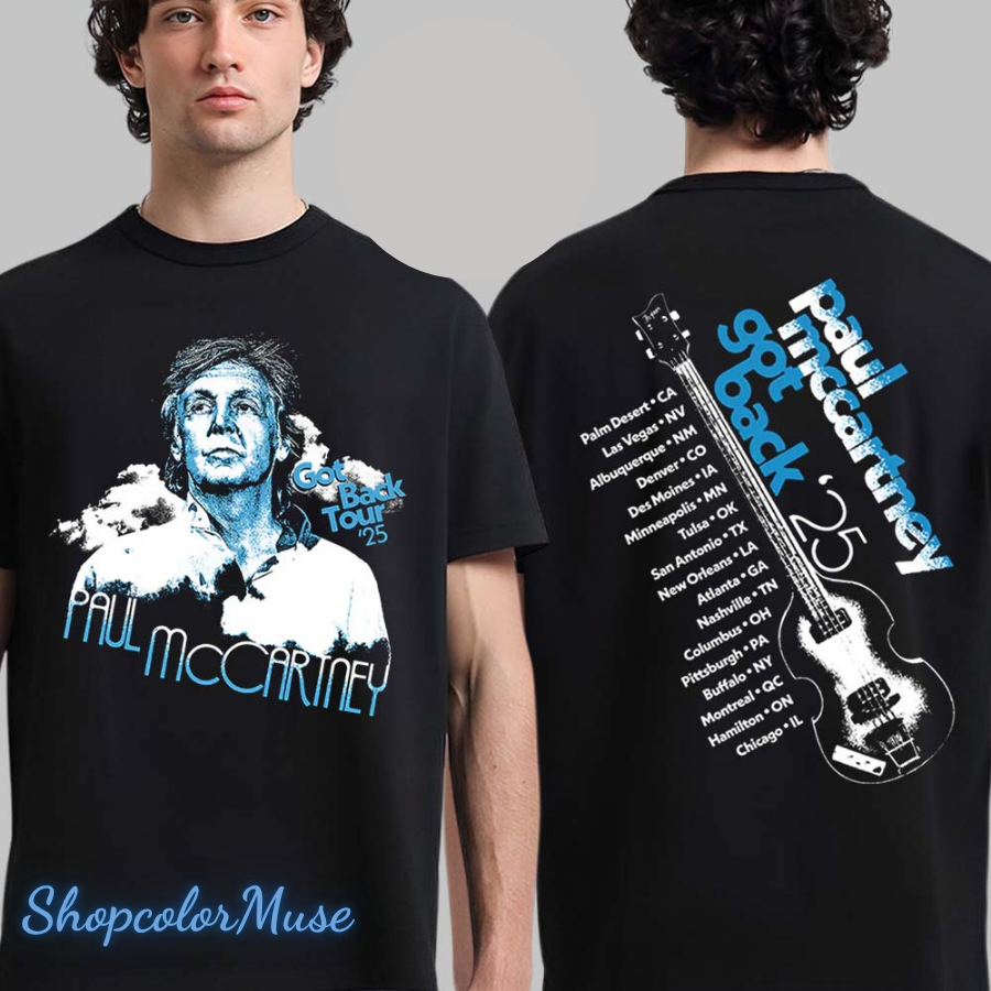 Paul Mccartney Got Back Tour 2025 Graphic Of Paul Mccartney With City Stops Guitar Two Sided T-Shirt
