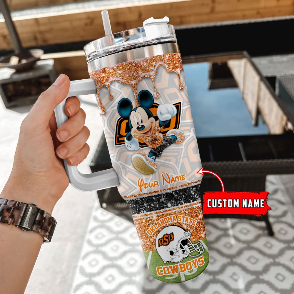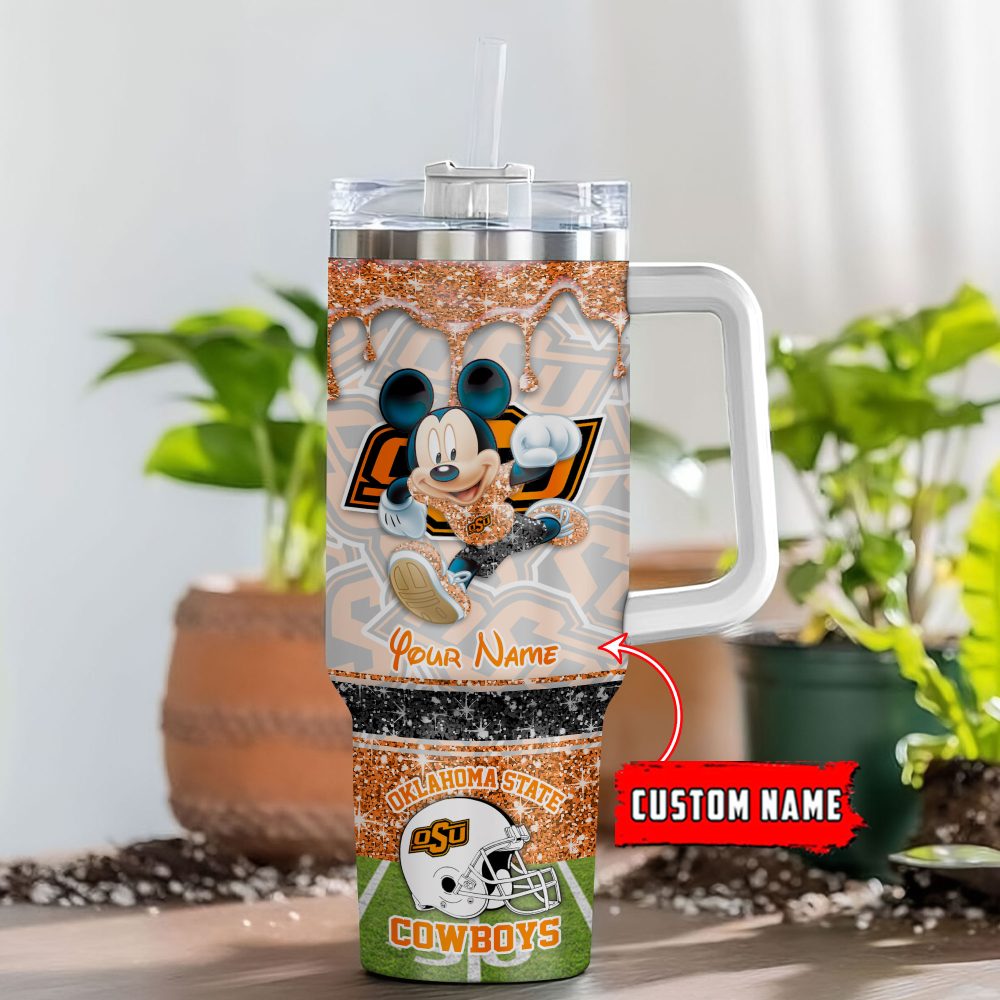Oklahoma State Cowboys Ncaa Mickey Mouse Glitter Custom Stanley Quencher 40Oz Stainless Steel Tumbler With Handle