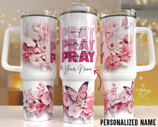 Pink Flower Pray On It Custom Stanley Quencher 40Oz Stainless Steel Tumbler
