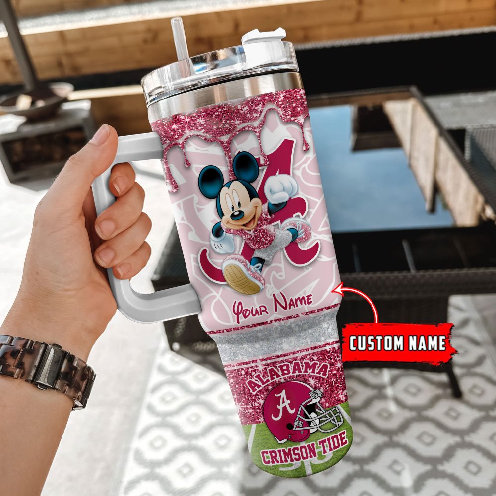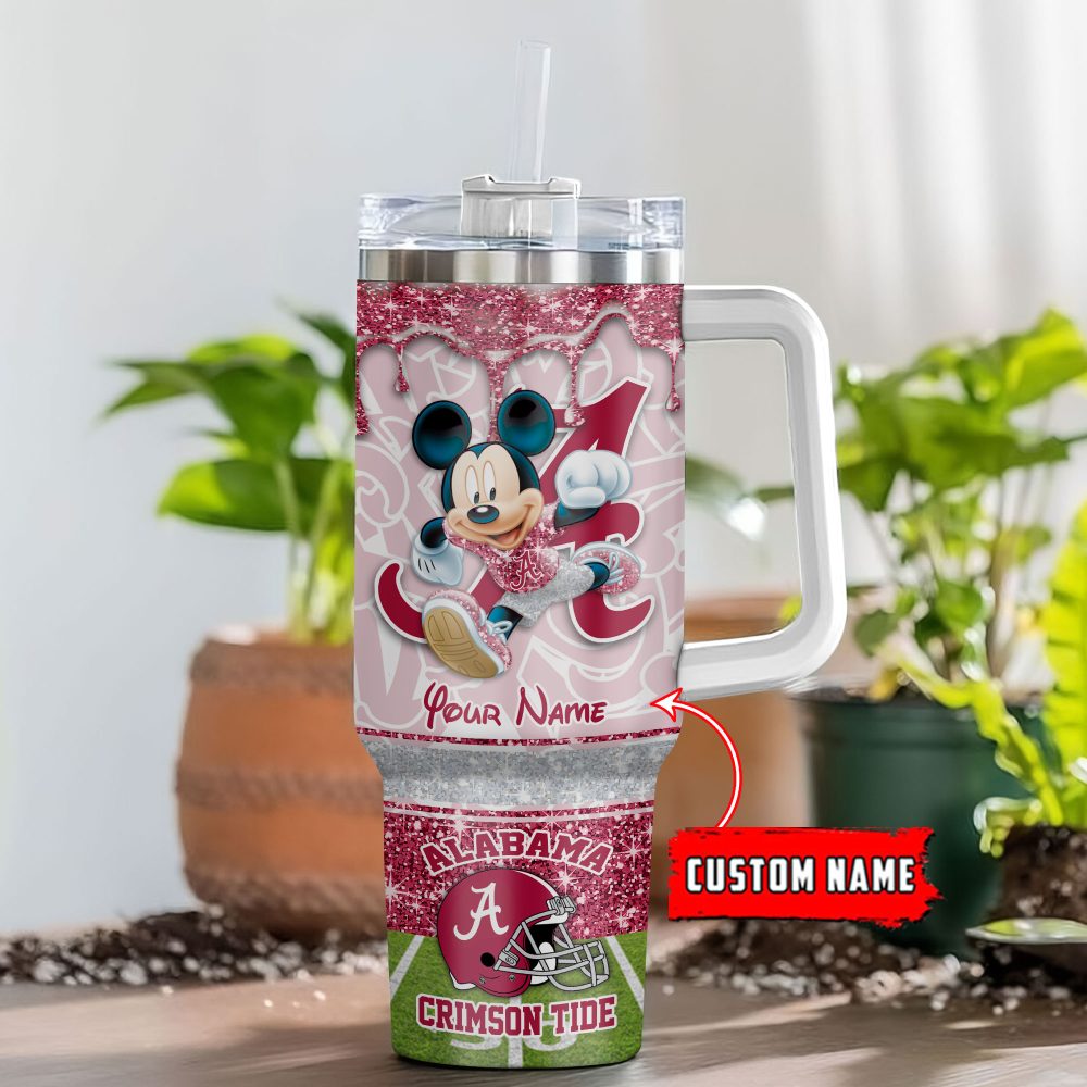 Alabama Crimson Tide Ncaa Mickey Mouse Glitter Custom Stanley Quencher 40Oz Stainless Steel Tumbler With Handle