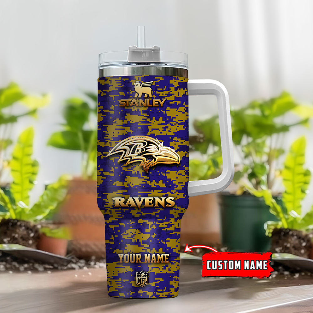Baltimore Ravens Nfl Camouflage Golden Logo Custom Stanley Quencher 40Oz Stainless Steel Tumbler With Handle