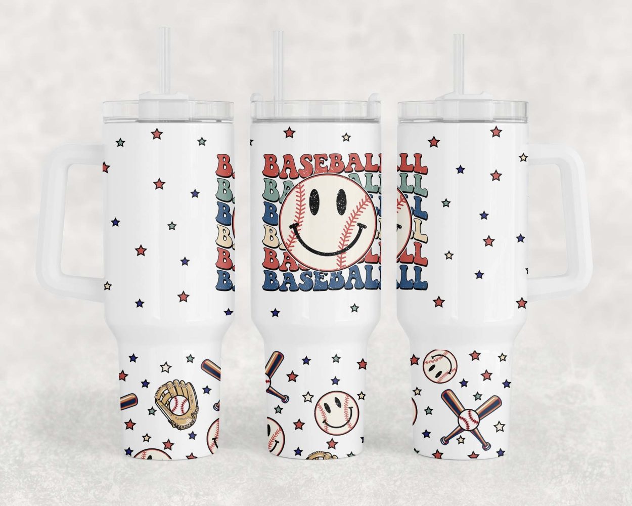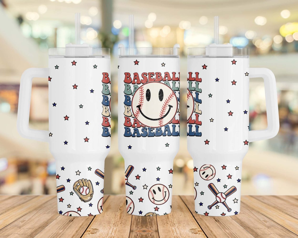 Baseball Retro Smiley Face Custom Stanley Quencher 40Oz Stainless Steel Tumbler With Handle