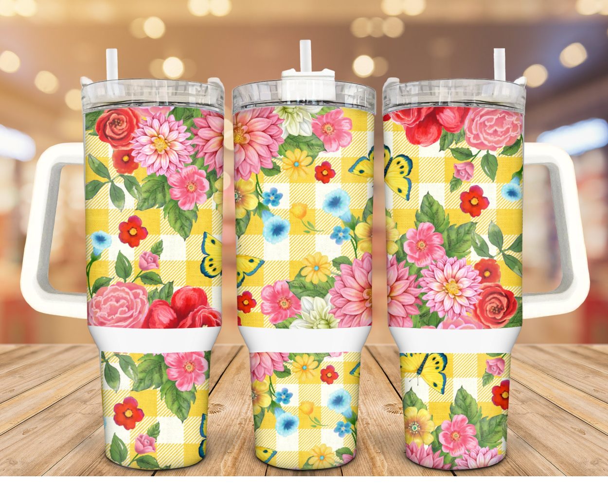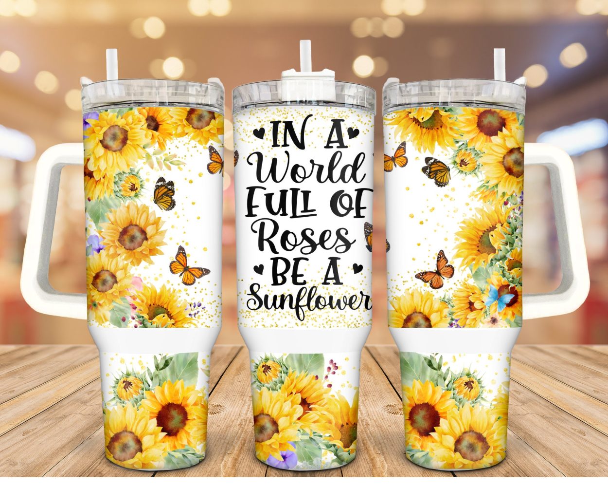 Bright Sunflower Butterfly Custom Stanley Quencher 40Oz Stainless Steel Tumbler With Handle