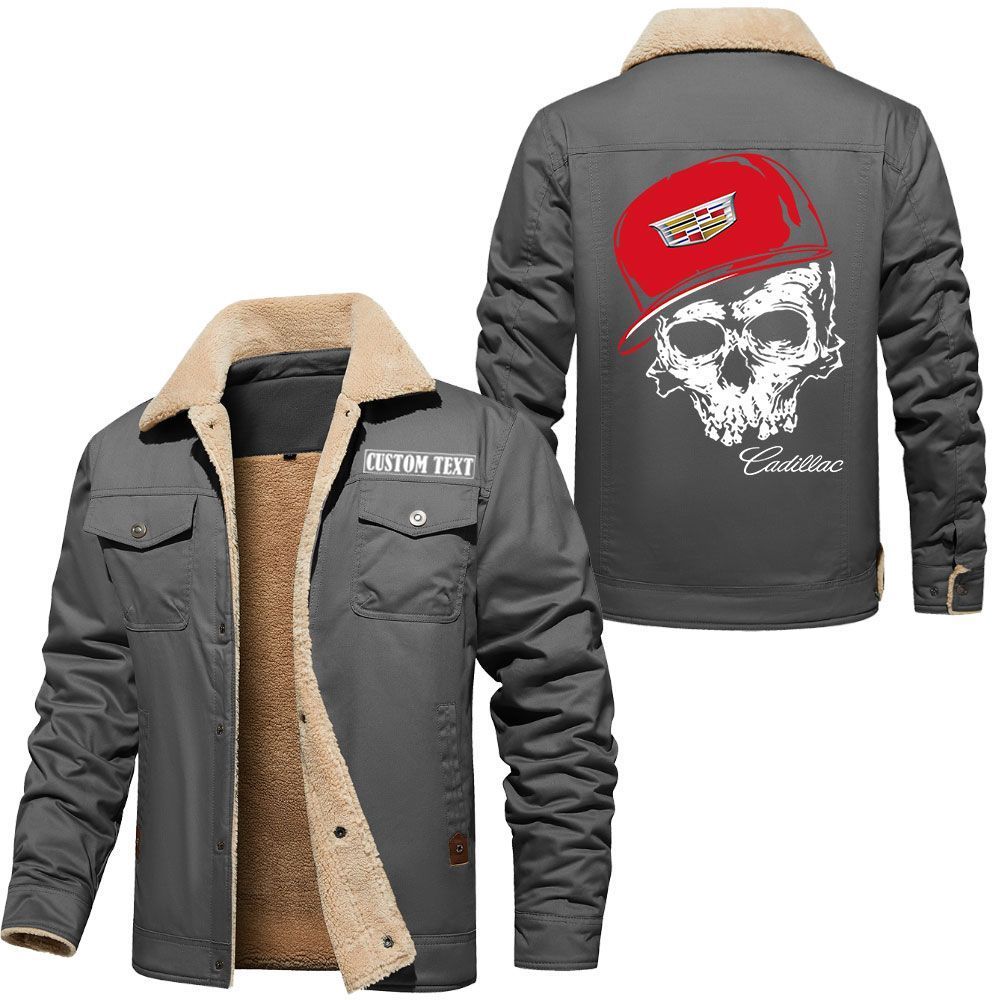 Cadillac Logo Custom Name Cargo Fleece Lined Cotton Jacket Personalized Outerwear with Skull Design