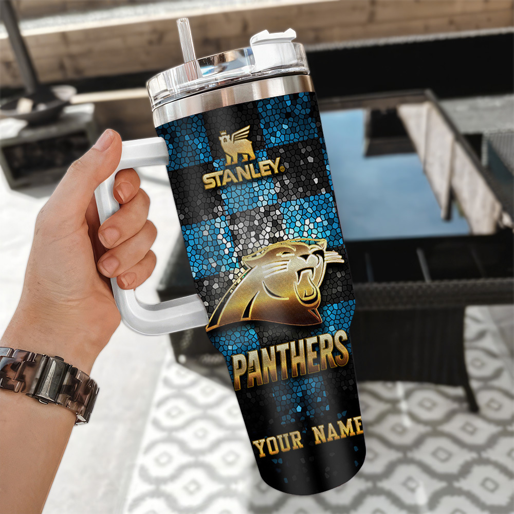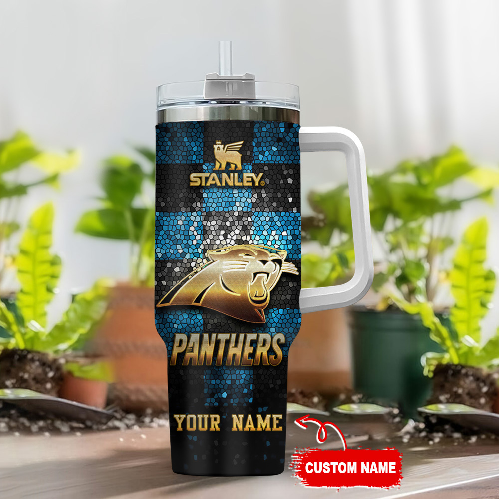 Carolina Panthers Nfl Glitter Golden Logo Custom Stanley Quencher 40Oz Stainless Steel Tumbler With Handle