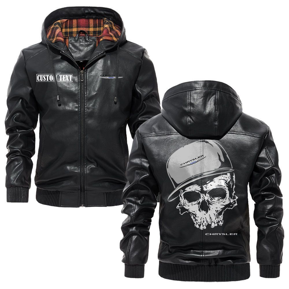 Chrysler Logo Custom Name Leather Hoodie Jacket Warm Outerwear with Skull Design