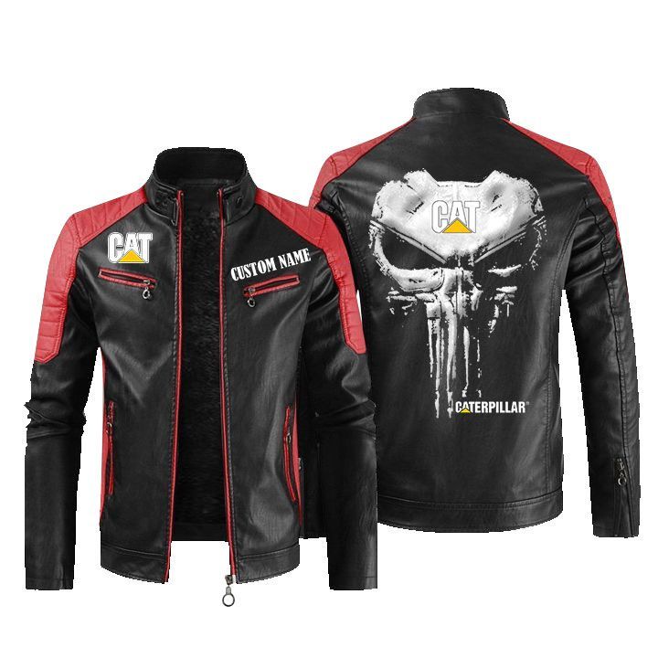 Custom Name Punisher Skull Caterpillar Inc Leather Biker Jacket