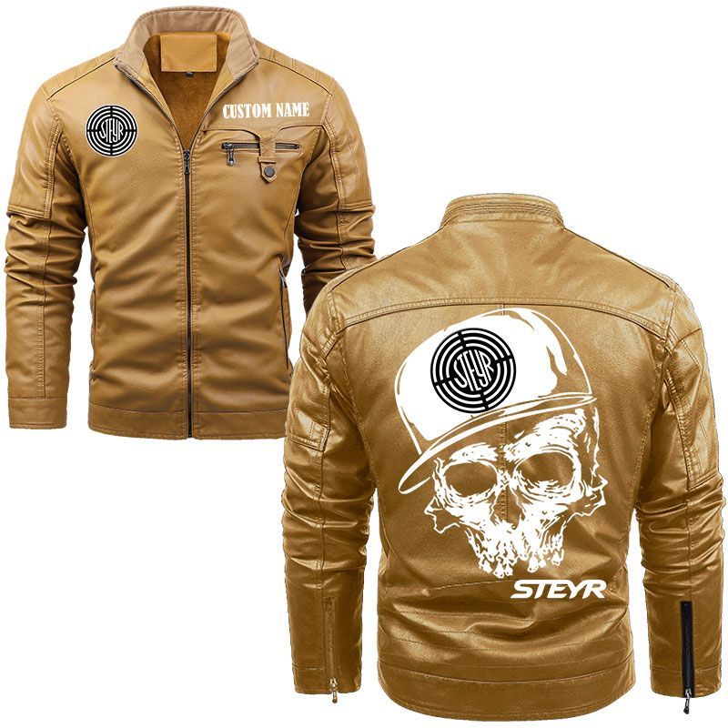Custom Name Skull Design Steyr Tractor Zip Pocket Fleece Leather Jacket