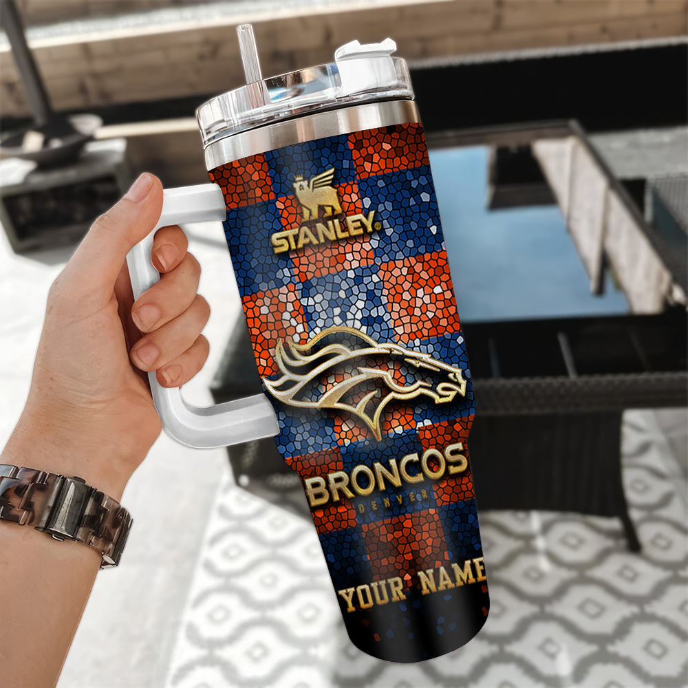 Denver Broncos Nfl Glitter Golden Logo Custom Stanley Quencher 40Oz Stainless Steel Tumbler With Handle