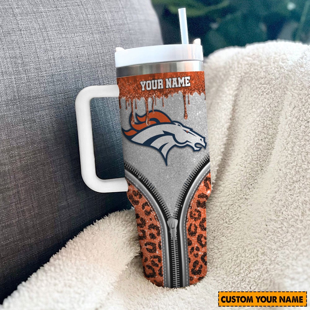 Denver Broncos Nfl Glitter Leopard Print Custom Stanley Quencher 40Oz Stainless Steel Tumbler With Handle
