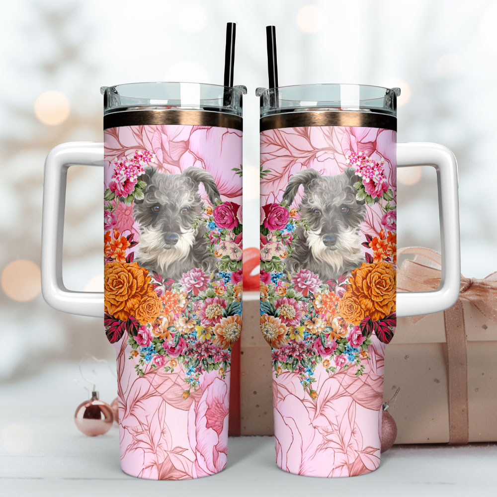 Dog And Flowers Custom Stanley Quencher 40Oz Stainless Steel Tumbler With Handle
