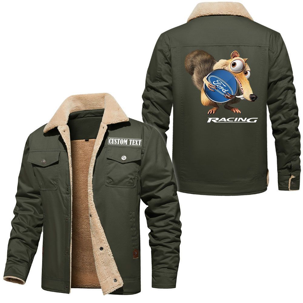 Ford Racing Logo Custom Name Cargo Fleece Lined Cotton Jacket Scrat Ice Age Design Personalized Outerwear