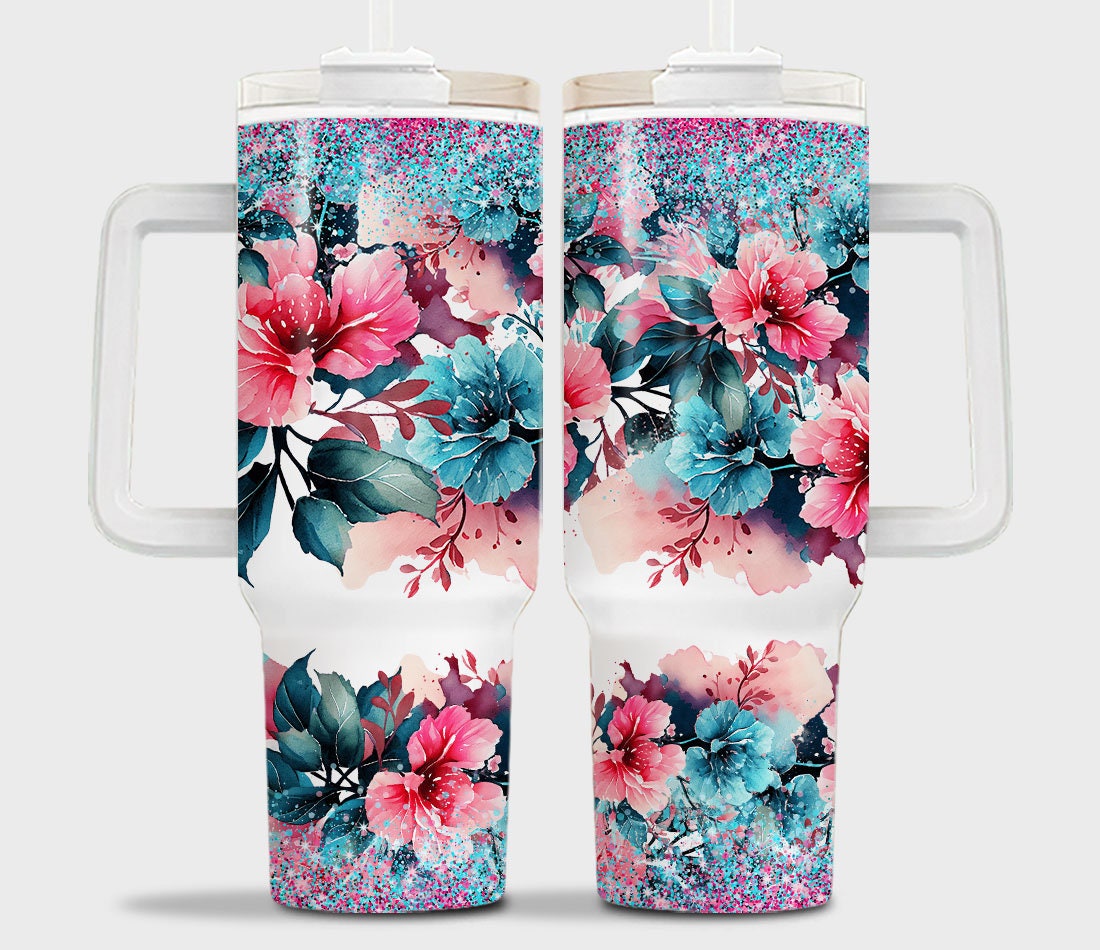 Glitter Floral Custom Stanley Quencher 40Oz Stainless Steel Tumbler With Handle
