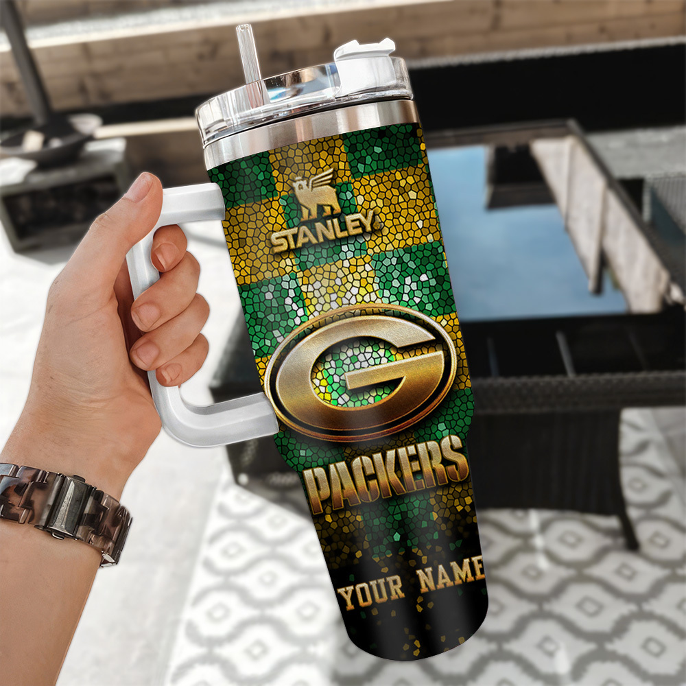 Green Bay Packers Nfl Glitter Golden Logo Custom Stanley Quencher 40Oz Stainless Steel Tumbler With Handle