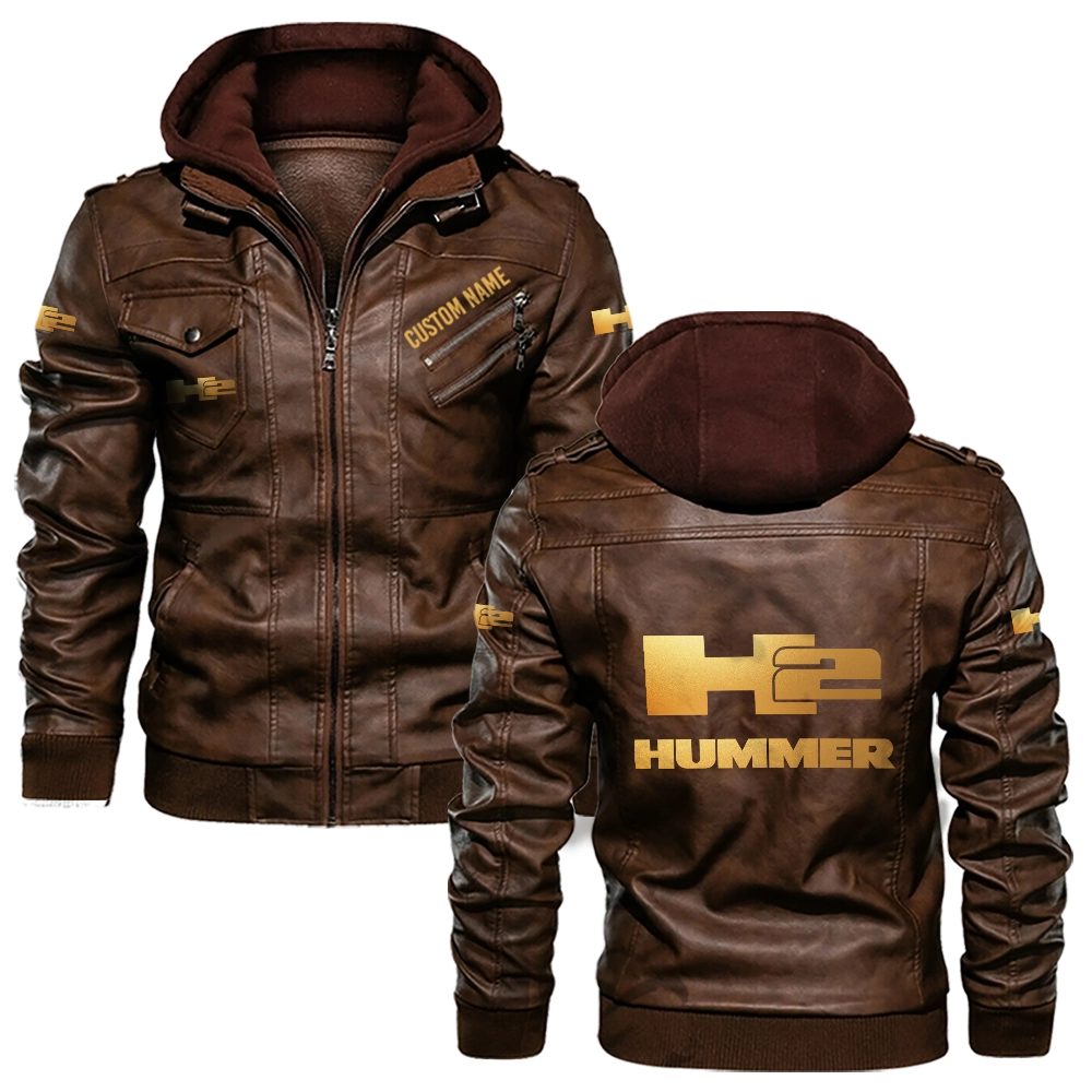 Hummer H2 Golden Logo Custom Hooded Leather Jacket Brown
