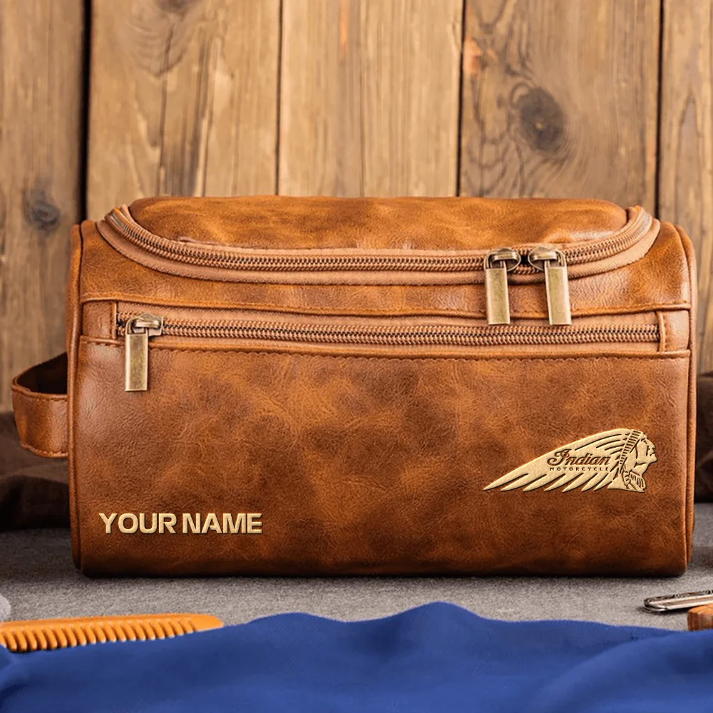 Indian Motorcycles Motorcycles Exclusive Logo Personalized Leather Toiletry Bag, Fishing Leather Toiletry Bag