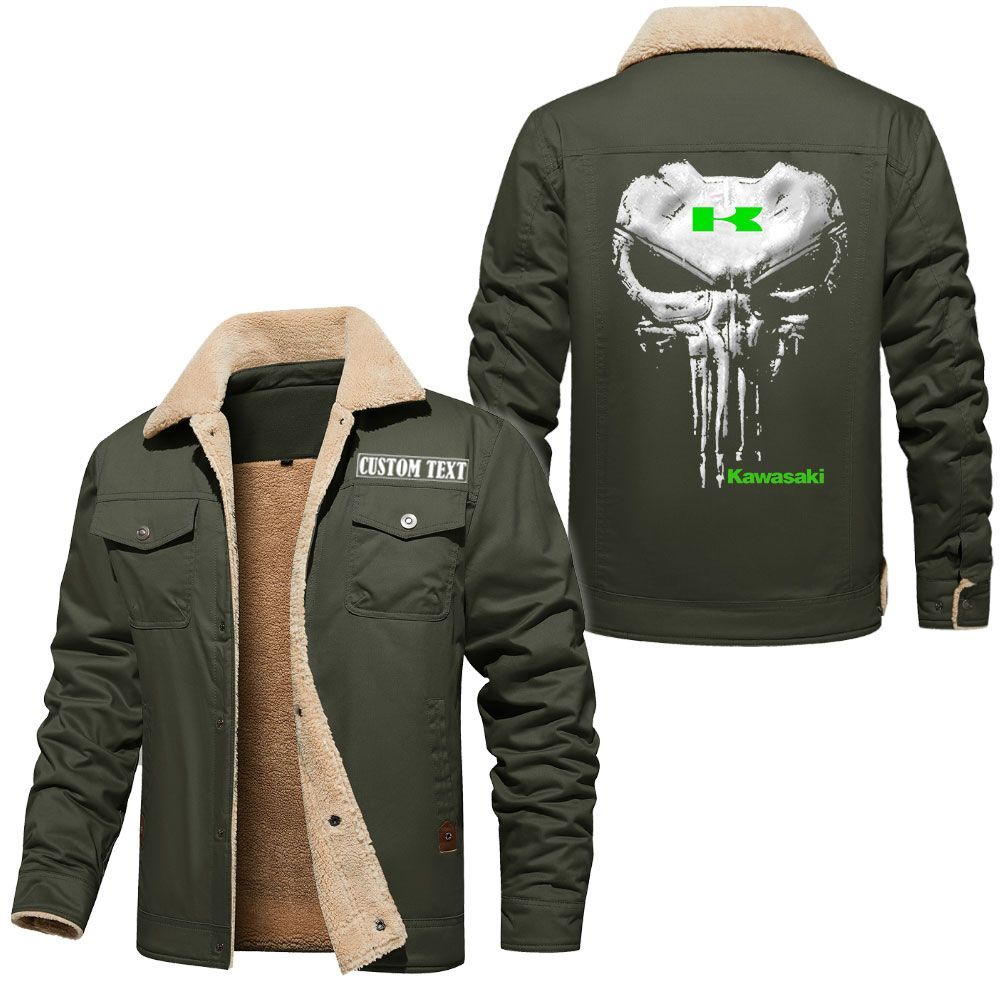 Kawasaki Logo Custom Name Cargo Fleece Lined Cotton Jacket Personalized Outerwear with Punisher Skull Design
