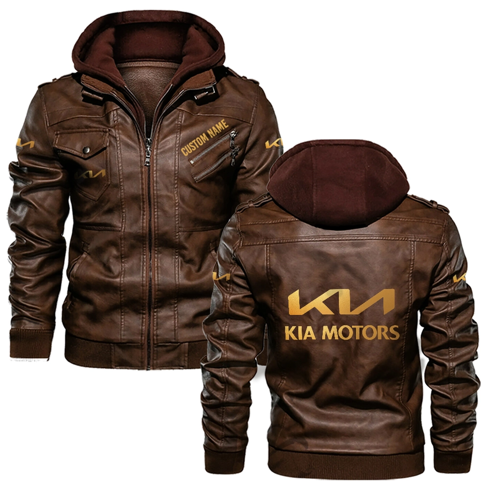 Kia Golden Logo Custom Hooded Leather Jacket Brown