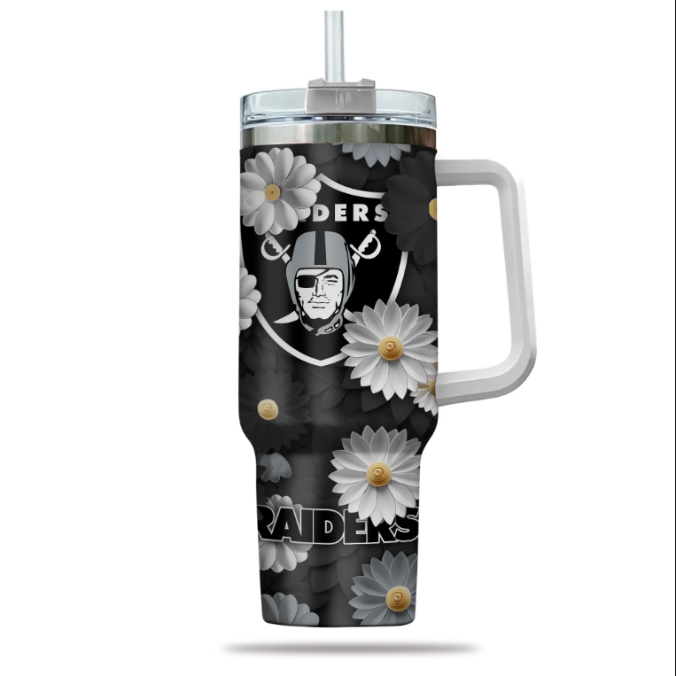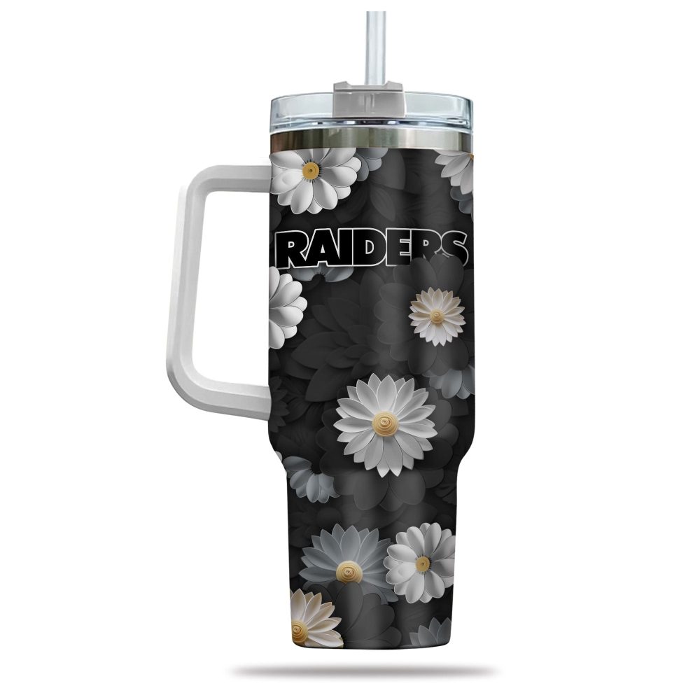 Las Vegas Raiders Nfl Flowers Custom Stanley Quencher 40Oz Stainless Steel Tumbler With Handle