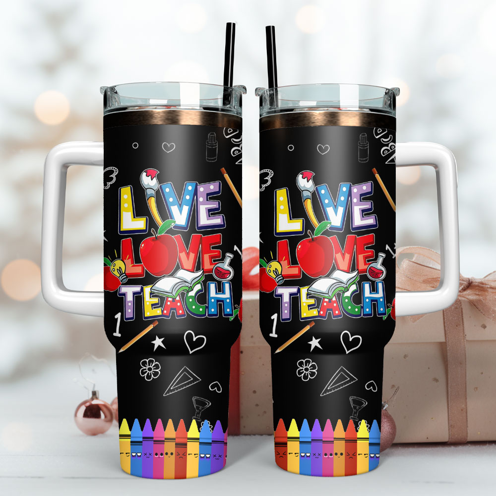 Live Love Teach School Theme Artwok Custom Stanley Quencher 40Oz Stainless Steel Tumbler With Handle
