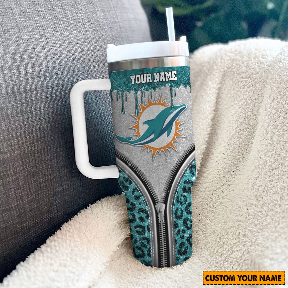Miami Dolphins Nfl Glitter Leopard Print Custom Stanley Quencher 40Oz Stainless Steel Tumbler With Handle