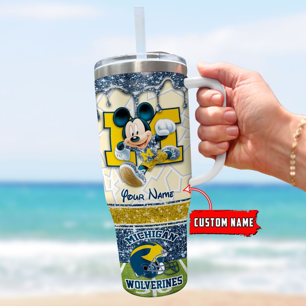 Michigan Wolverines Ncaa Mickey Mouse Glitter Custom Stanley Quencher 40Oz Stainless Steel Tumbler With Handle