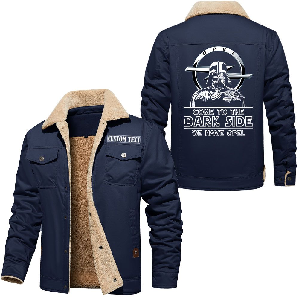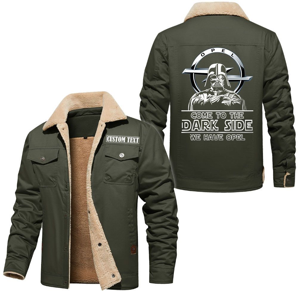 Opel Logo Custom Name Cargo Fleece Lined Cotton Jacket Personalized Outerwear with Dark Side Star Wars Design