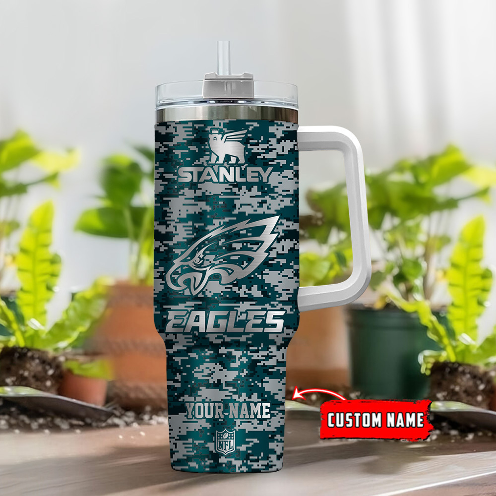 Philadelphia Eagles Nfl Camouflage Silver Logo Custom Stanley Quencher 40Oz Stainless Steel Tumbler With Handle