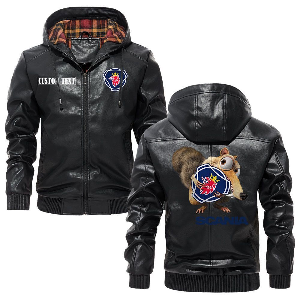 Scania Logo Custom Name Leather Hoodie Jacket Warm Outerwear with Ice Age Theme
