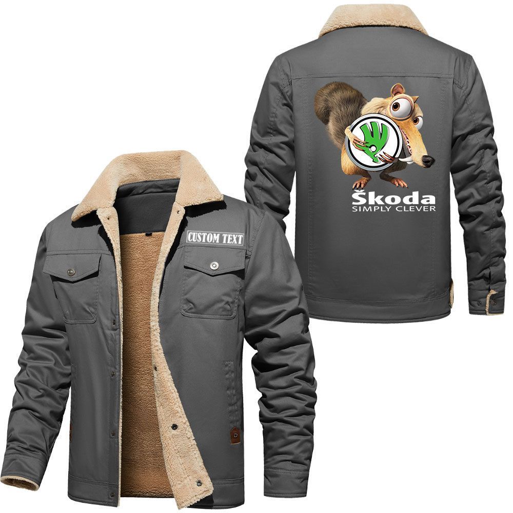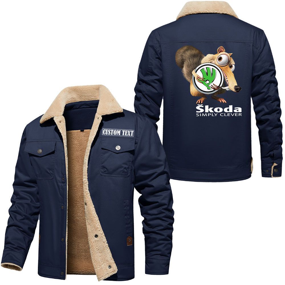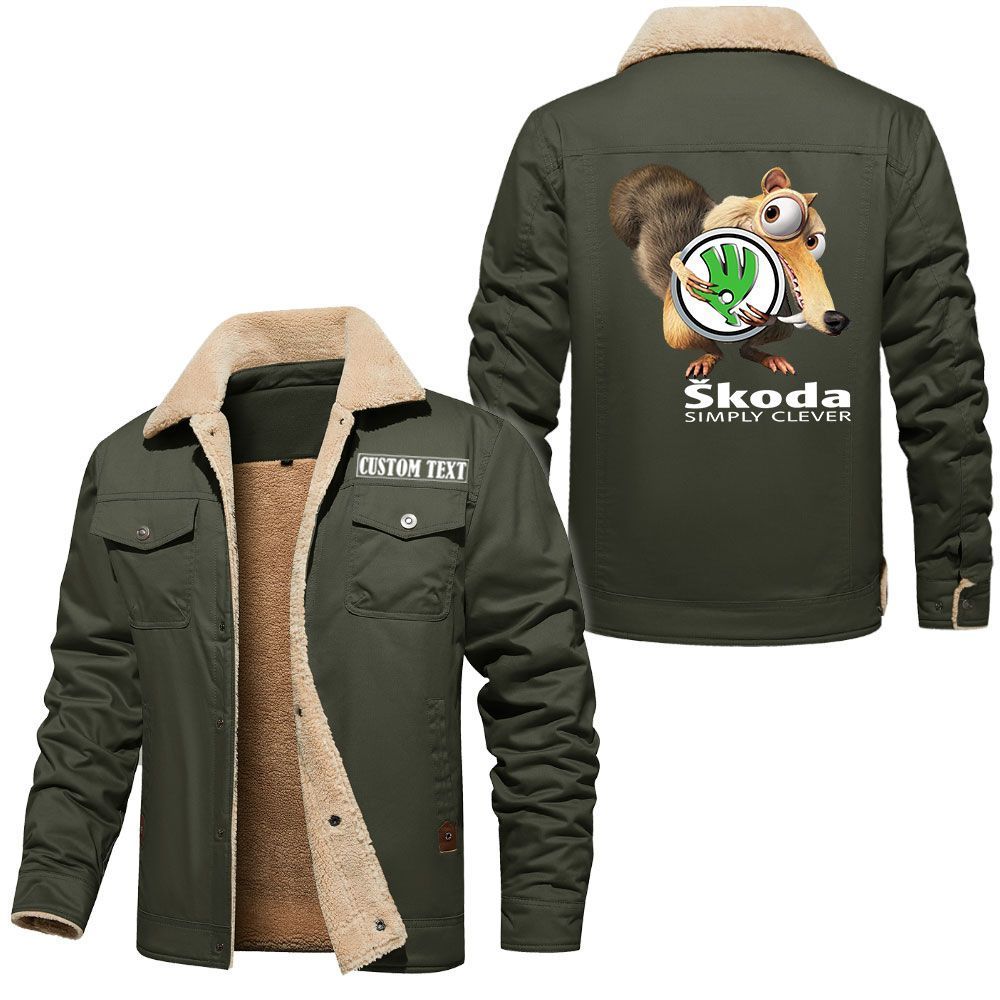 Skoda Logo Custom Name Cargo Fleece Lined Cotton Jacket Scrat Ice Age Design Personalized Outerwear