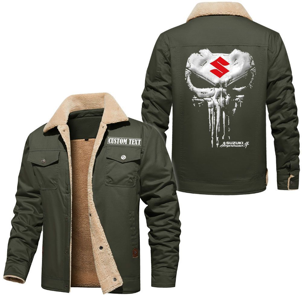 Suzuki Hayabusa Logo Custom Name Cargo Fleece Lined Cotton Jacket Personalized Outerwear with Punisher Skull Design